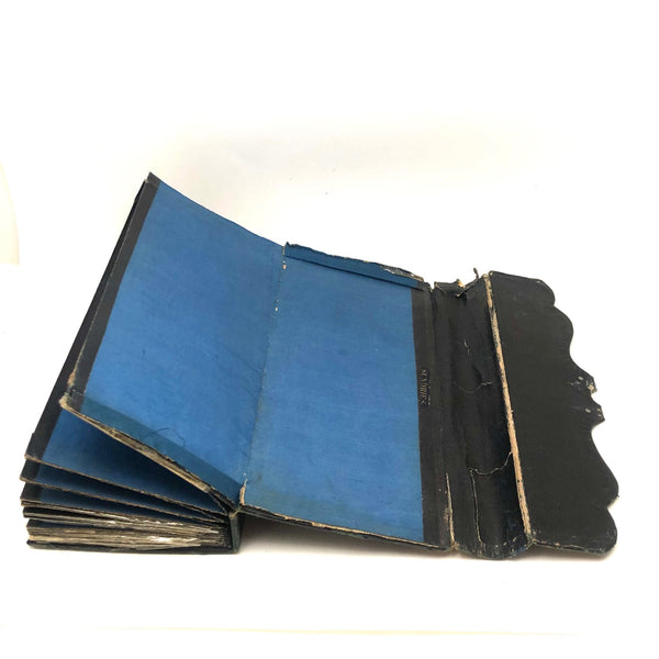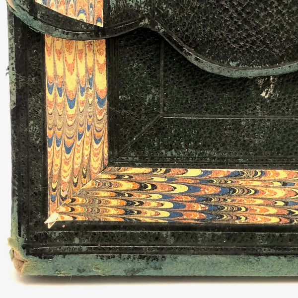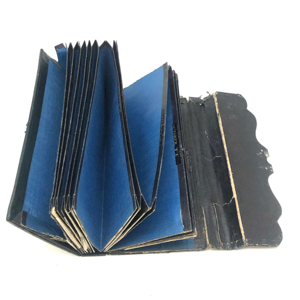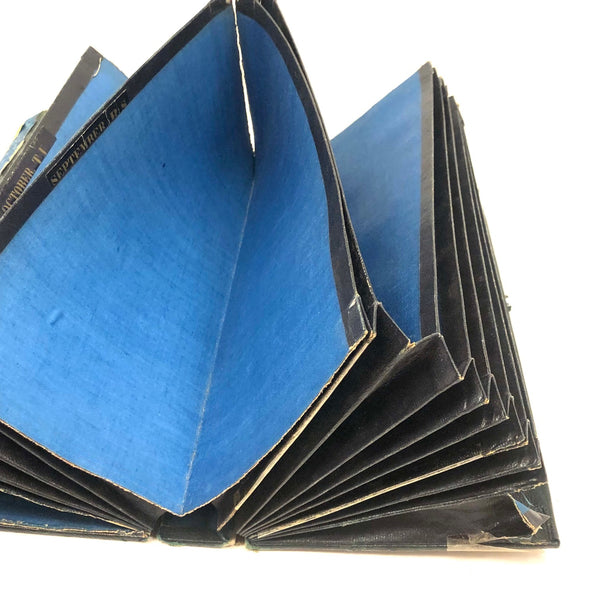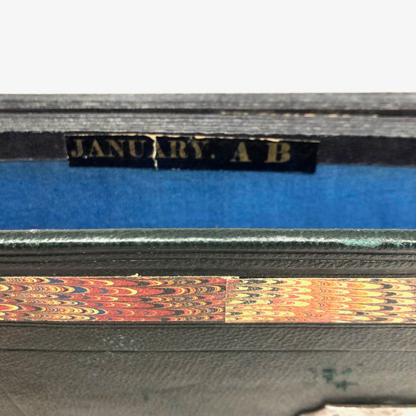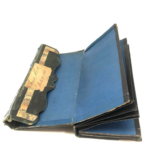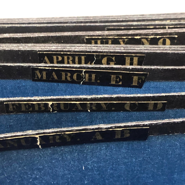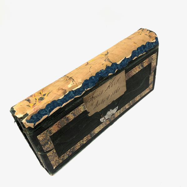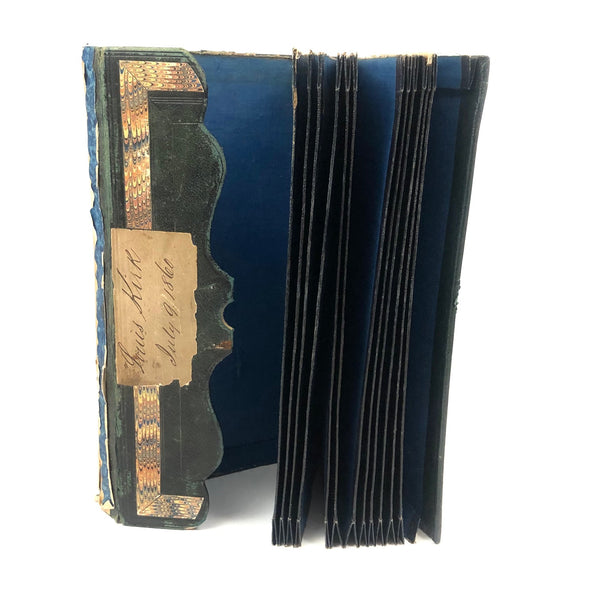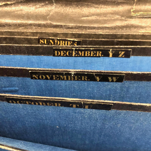 I find this so beautiful just as an object, and if one were fairly gentle with it, it could be put to use again as an organizer. The exterior is leather with marbled paper border on the face, and more marbled paper over the top of the back. Inside, lovely blue fabric covering divided sections, trimmed in black, each labeled in gold lettering with the month/letters of the alphabet and terminating with "Sundries" at the rear. With "Louis Kirk, July 9, 1860" hand-written in ink on paper adhered to the front. A special feeling thing teeming with a sense of history, and, one imagines, having held a lot of bills that came and went! Found in the Hudson River Valley.