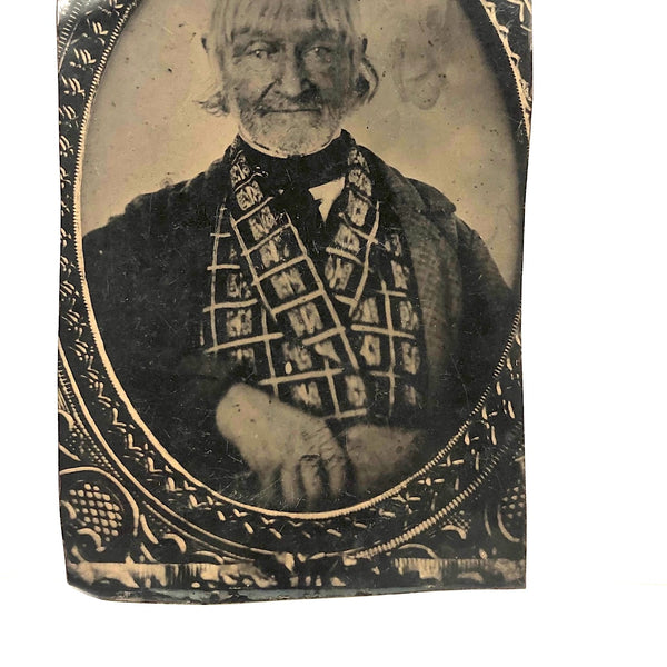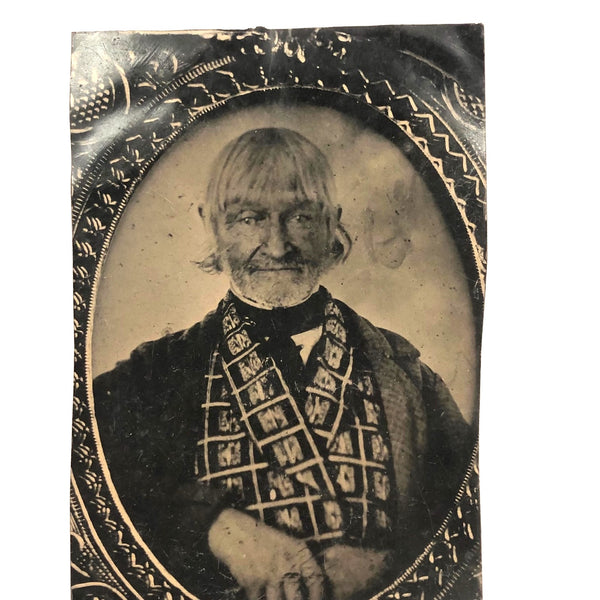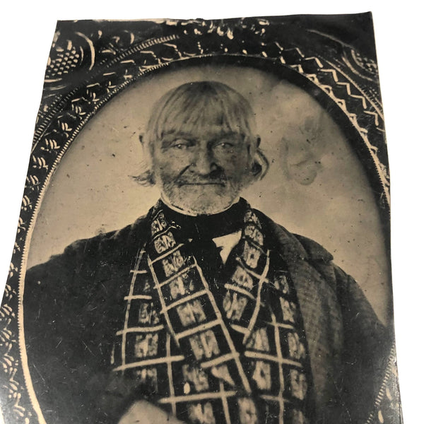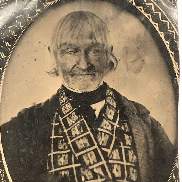 Quite a presence this guy is--I believe a full plate tintype that was trimmed down some, 7" x 4" now. Being endlessly interested in photos of earlier photos, part of what drew me it that this is clearly that--a tintype of an earlier cased photo, likely a daguerreotype. And the size of the tintype would lead one to believe that whoever had it done wanted a large enough copy not to lose a detail! The seller I purchased this from thought his breastcoat to be printed with Federal eagles; I am not completely sure, but it may well be so--which would suggest he was veteran, perhaps even of the Revolutionary War, who knows? I think his face is amazing and makes me think of Klaus Kinski in a Herzog film. Definitely a character who lived a life, and an interesting one to keep company with now.