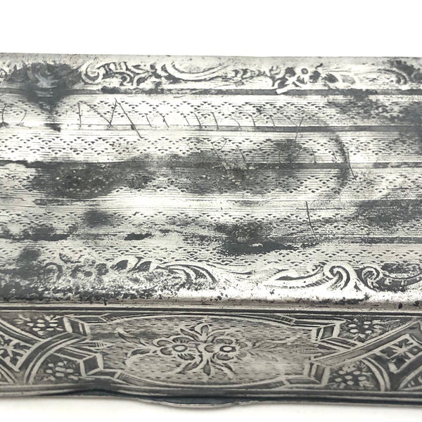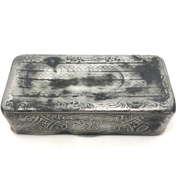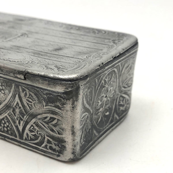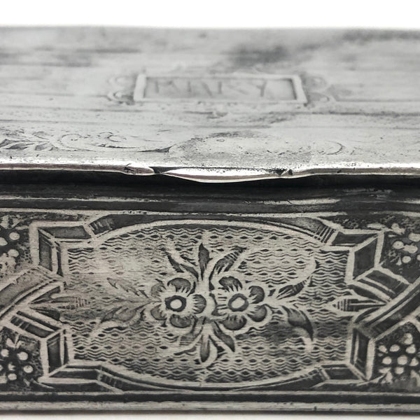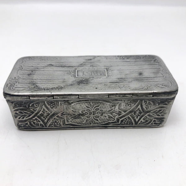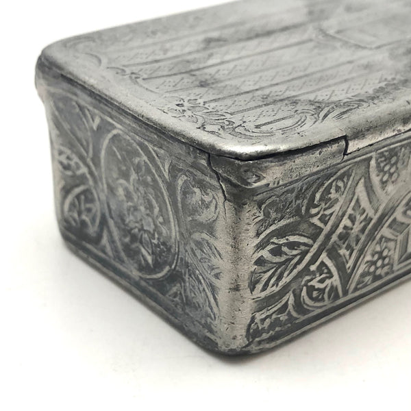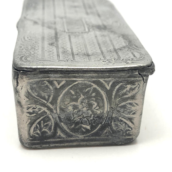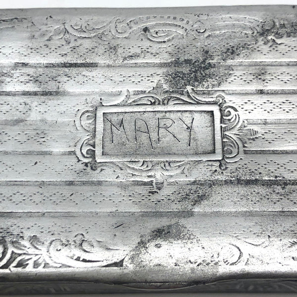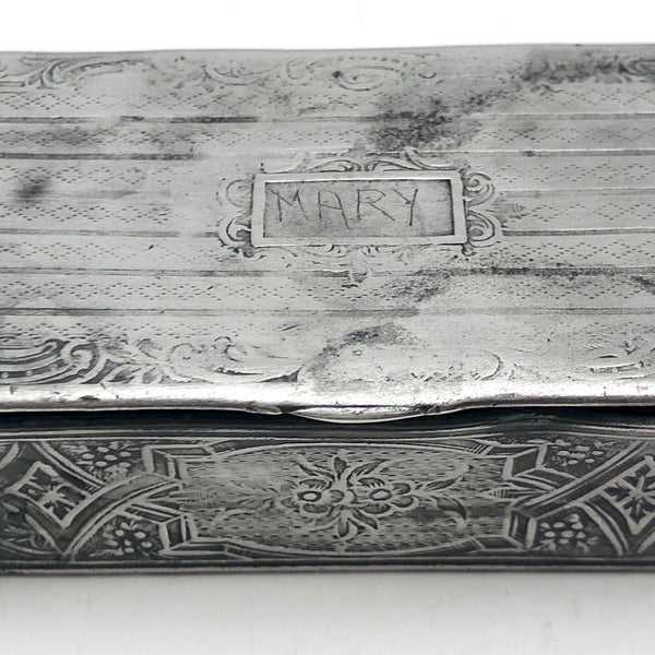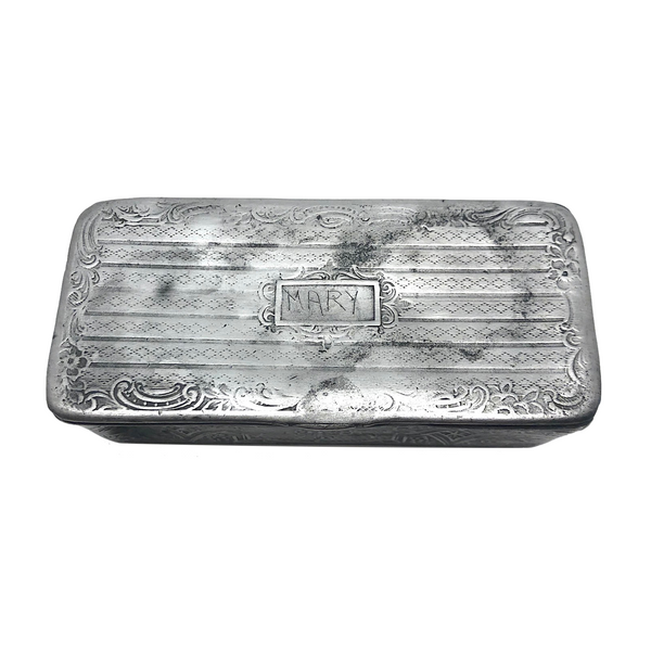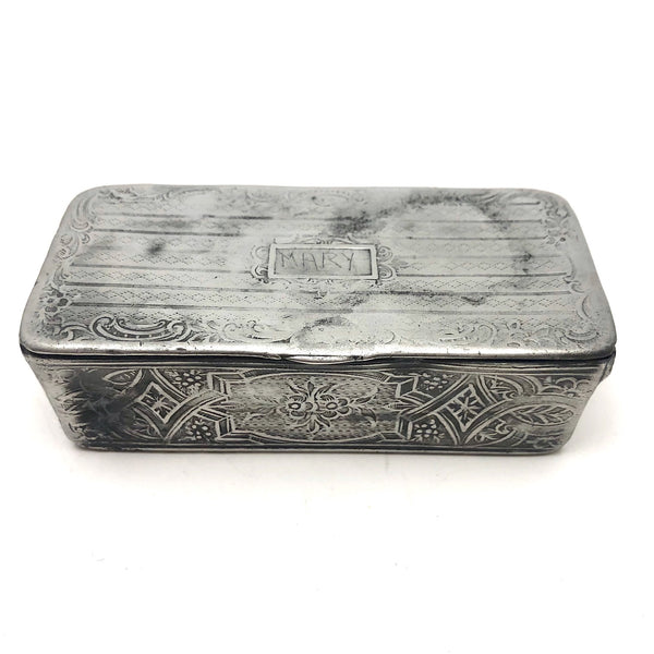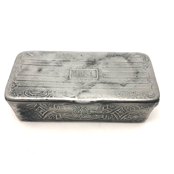 What sold me on this 19th century snuff box is the juxtaposition between the fineness of its decoration and the clearly hand-scratched "Mary." I thought it likely that Mary did this herself, but on the underside of the box in what appears to be the same hand one can just make out "To Mummy"!