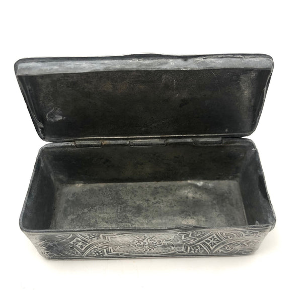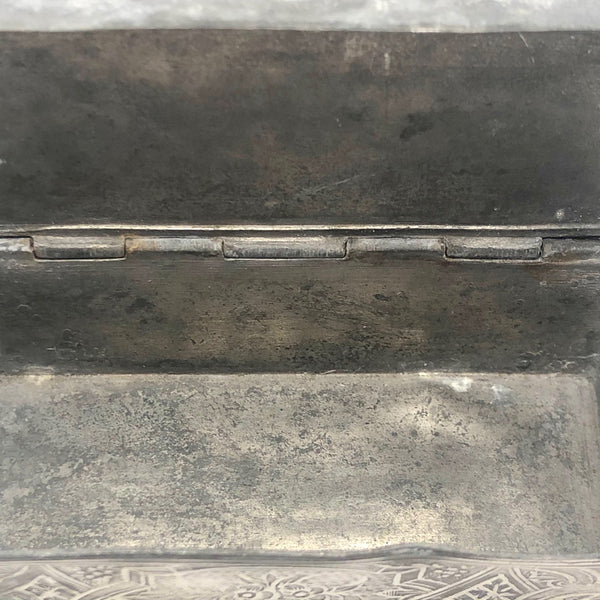 3 3/8" long x 1 5/8" deep x 1 1/16" tall. There is one minor tear to the upper back corner. Hinges are in great shape and lid closes flush.