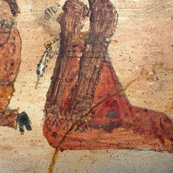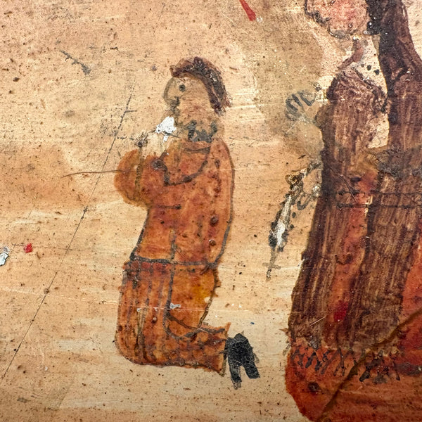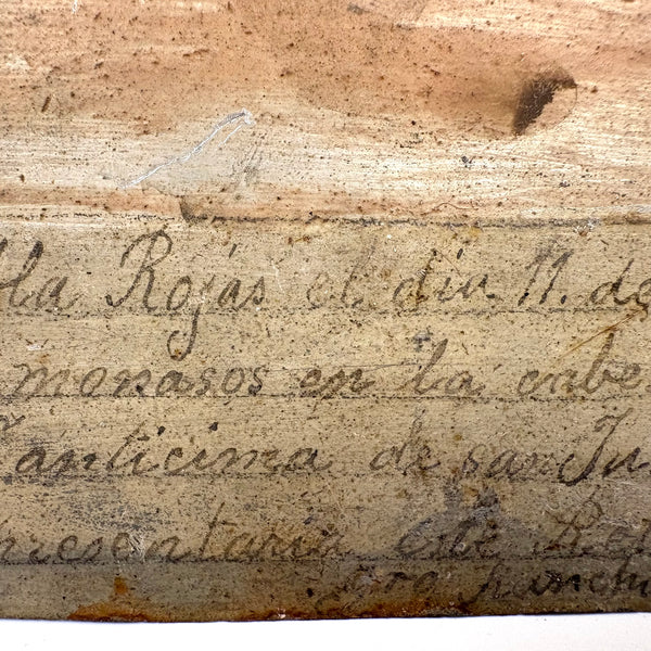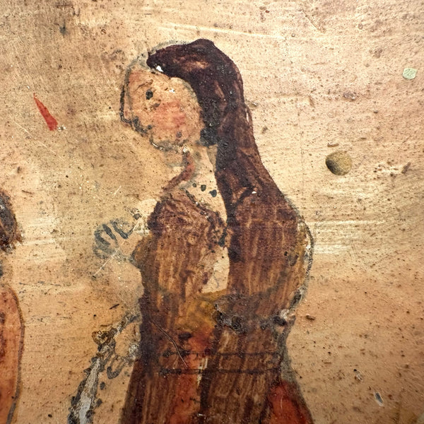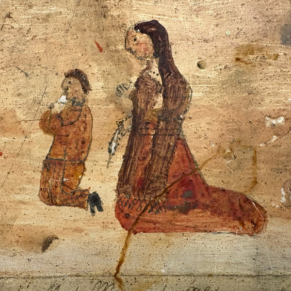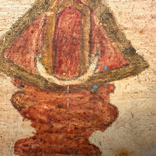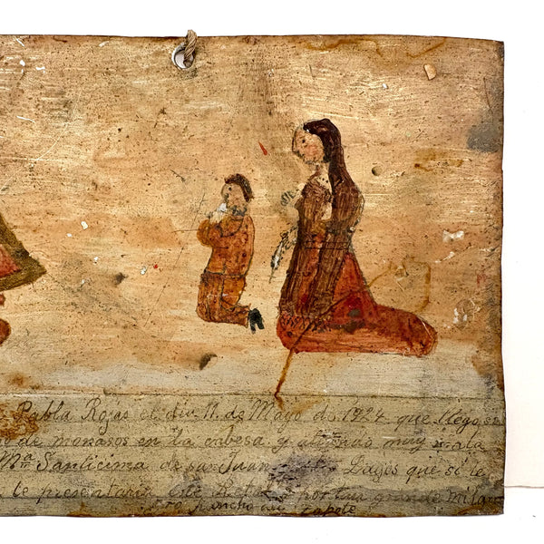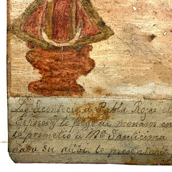 I made a bit of effort to translate the text here, but couldn't quite piece it together--what is clear is that expresses thanks to Our Lady of San Juan for answering the prayers of Pabla Rojas on May 11, 1924, and that it is a very lovely and tender one; look close, and you will see that the kneeling woman, with wonderfully beatific face, is holding in her very sweetly outlined hand a very sweetly detailed rosary with gold cross hanging. And what a charming tiny face on Our Lady, and on our kneeling man, too. All rendered in rich shades of orange, rust and gold, very painterly, and with a fantastic surface to it all. Love.