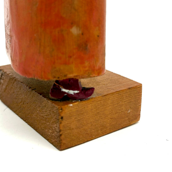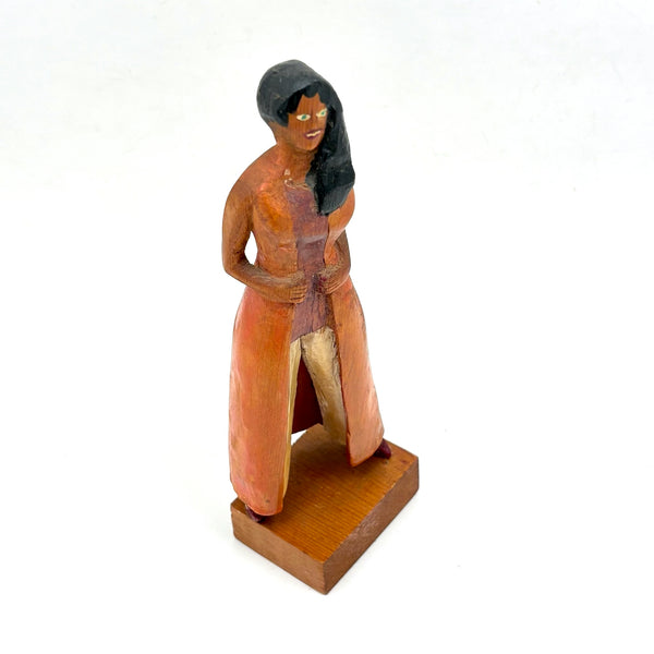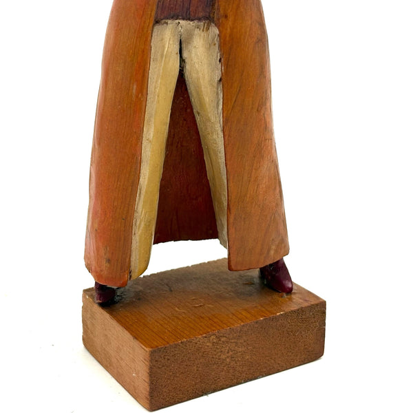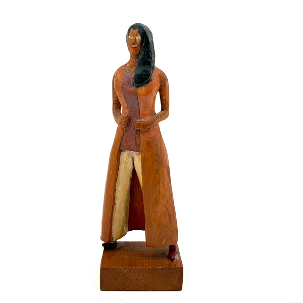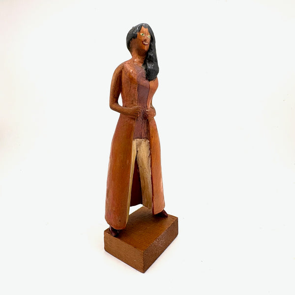7 5/8" t x 2 7/16" w x 1 3/4" d at base. Signed Shepp and dated 1970s along the bottom of her coat on the back side. Very good condition, with one bit of white paint showing along the side of one shoe, which may be a repair. Sound and stable now.
