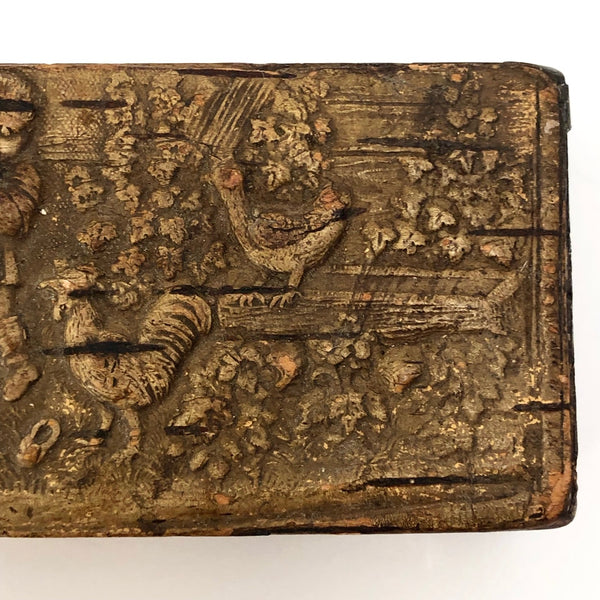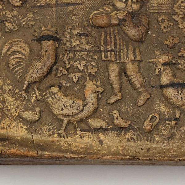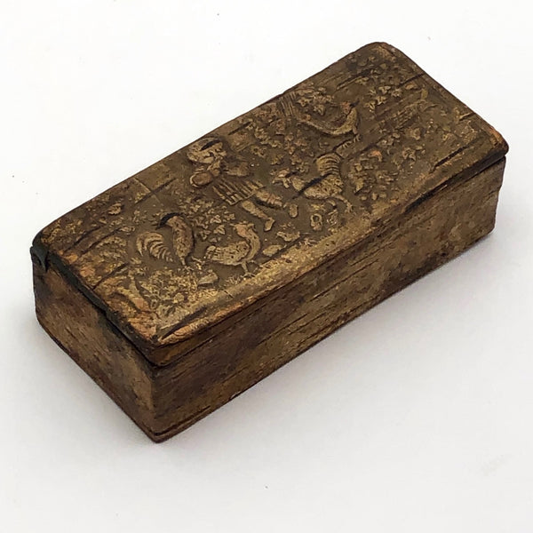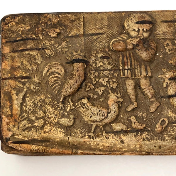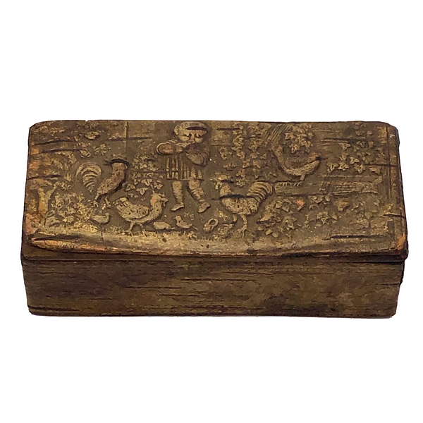 The hinged box, which I believe dates to the second half of the 19th century, is made of solid wood with a birch bark veneer pressed/embossed with with this wonderful image of a very anxious-looking child surrounded by roosters, chickens and a few tiny chicks. I've found a few other snuff boxes like this that portray humorous scenes, and I believe here at the child's feet is a tiny little lock, implying that chickens have flown the coop! The sides of the box feature a scroll of what I believe are leaves and vines and other decorative flourishes, and the interior is lined in birch bark as well. Quite a fine and charming little box, I think, and great addition to the collection of any box lover (like me!)