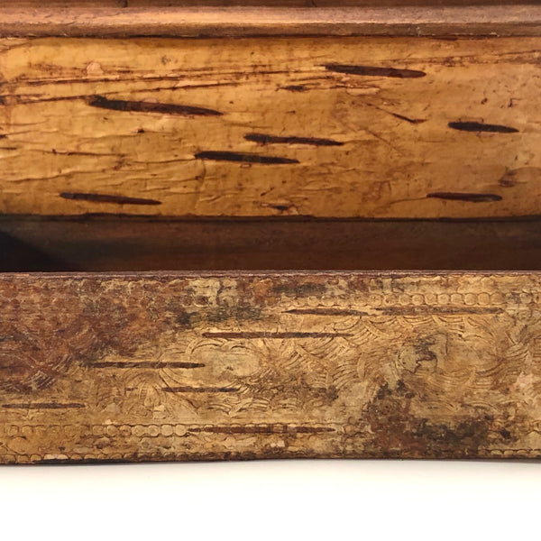 The box measures 4" long x 1 7/8" deep x 1 1/4" tall. It is a fairly delicate piece in good antique condition. There are a few small chips in the exterior bark along the edges, some darkening on the sides, and a bit of peeling off/loss of adhesion on one part of the back side (I have not touched it, but it appears that it would be easy to glue back firmly in place; as is one does not notice it has come loose unless carefully inspecting it). It opens and closes fine.