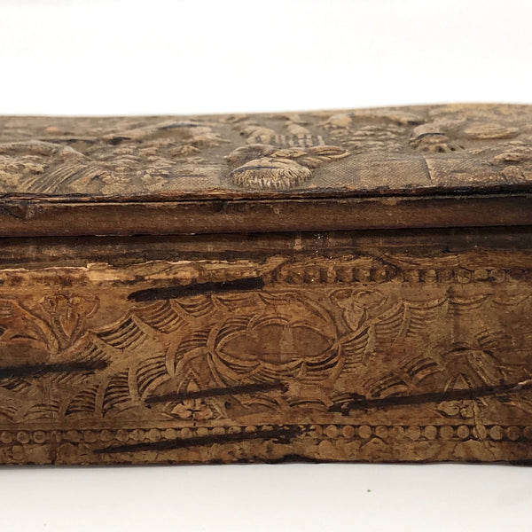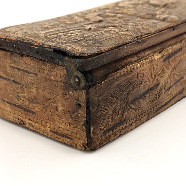 I had not seen a box like this one before I found it, but have learned that it is an antique snuff box representative of a whole genre of figurative birch snuff boxes made in the 18th and 19th century in Scandinavia and Germany, and also it seems in the U.S., as I found one in the collection of the Boston Museum of Fine Arts portraying the death of a general at the Battle of Bunker Hill in 1775!