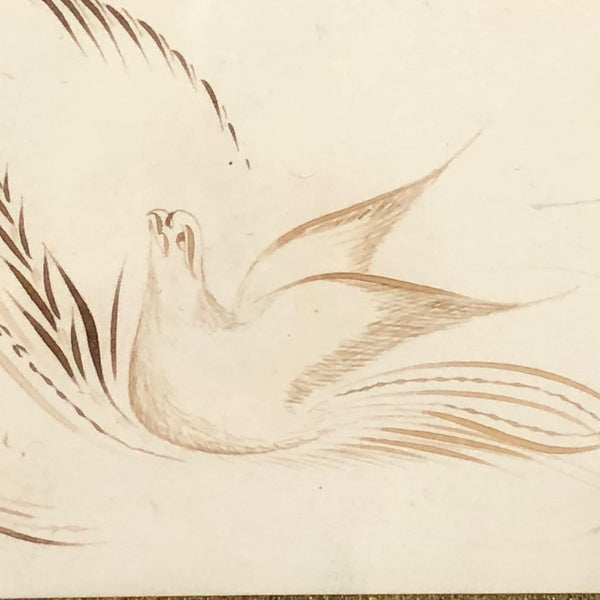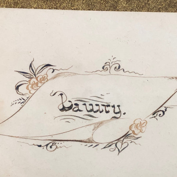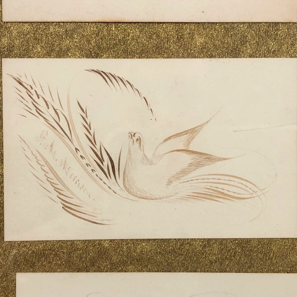You know I love Spencerian calligraphy--all those birds and flourishes and beautiful lettering--but what makes this especially special, and rarer, is that it appears to have been a salesman sample / calligrapher's display piece, showing examples of the sorts of calling cards that could be ordered by clients. The banners of the upper left card together read "Cards / Written / To Order," and the seven others show an array of options for the sorts of cards that might be ordered. All mounted in a grid to gold paper in what I believe is the original frame in which they were displayed.