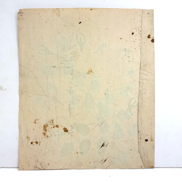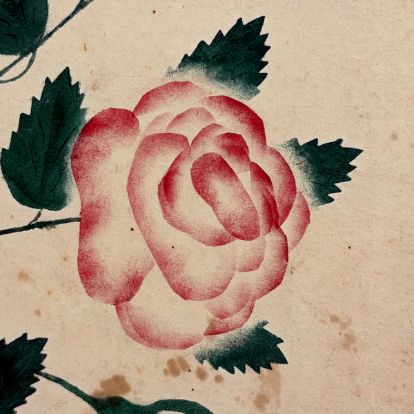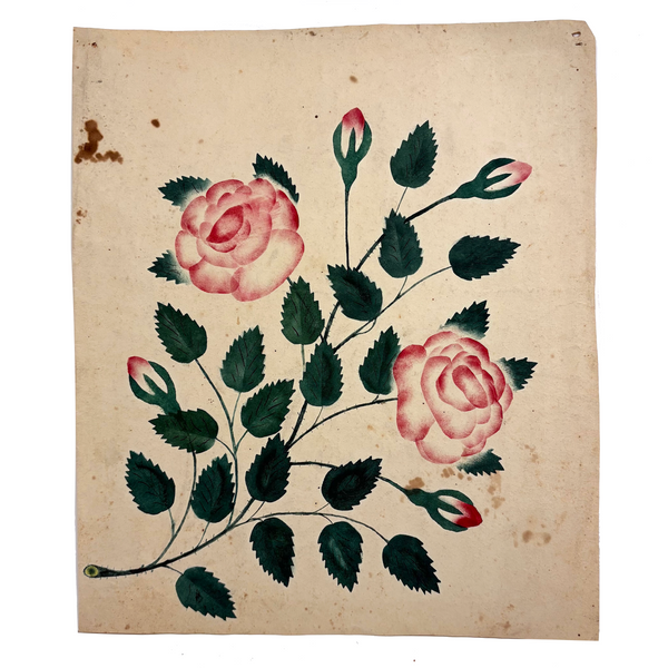 Just lovely, I could look at early theorem watercolors like this all day, to my eye so lush and radiant and almost electric feeling. Contemporary feeling too; the concentration of color along the hard edges (created using stencils, and blowing paint with a glass straw), as on the rose petals here, always makes me think of the paintings of Roger Brown. I know from the other two I found this one with, clearly by the same maker, that it dates to the late 1840s or so.