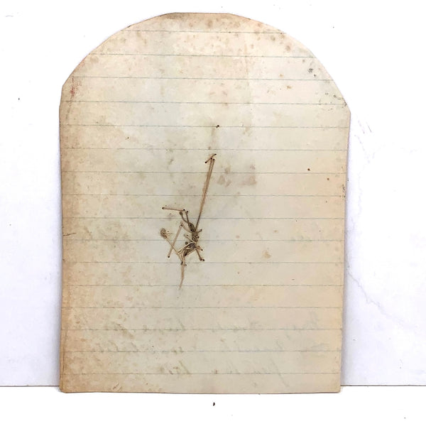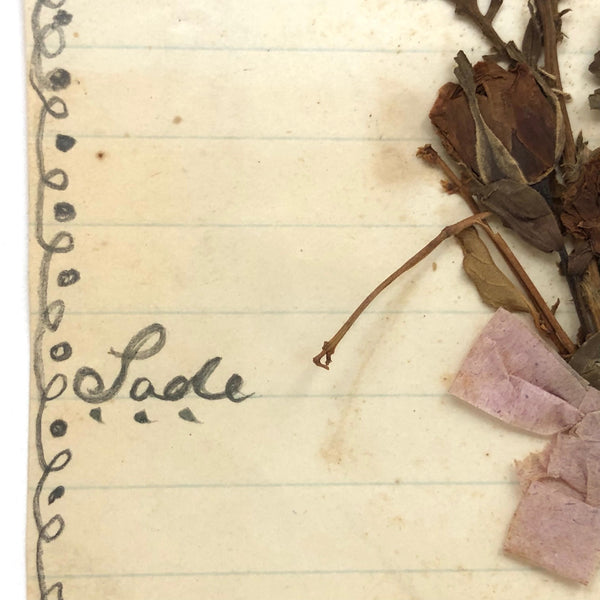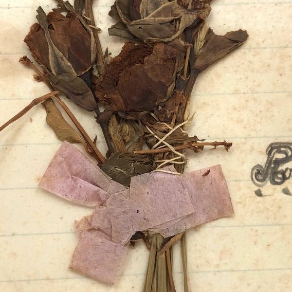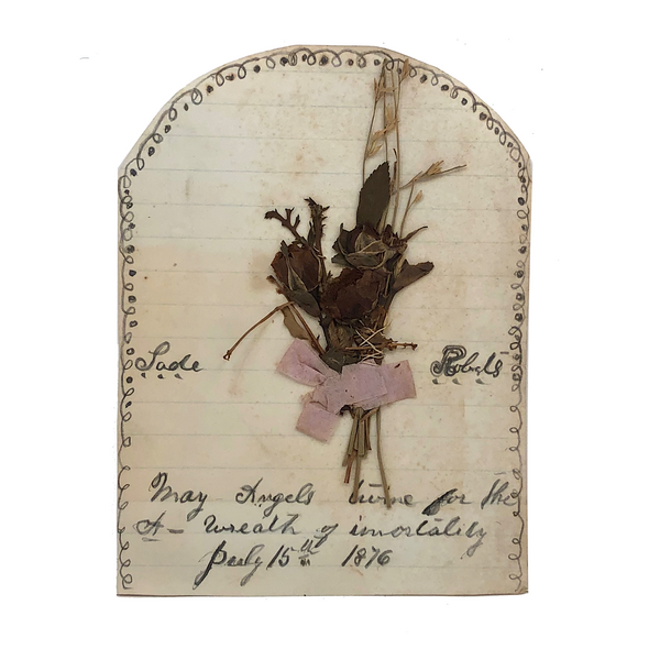 Paper is the one thing I tend to accumulate; most objects I buy I list right away, but I do have a stack of wonderful little paper things like this that tend to pile up--and when I pull them out to get to listing them, I am delighted all over again by their existence! This one was among a small pile of naive 19th c. drawings by a young Emma Dilmore I purchased several months ago--I believe she made this one too: a momento for a Sade Roberts (I believe it says) dated 1876. Between the tombstone shape of the paper, and the lovingly drawn curlicue and dot patterned border, and the careful hand-stitches tethering the small bunch of dried roses to the paper, plus that pink paper bow, I find it a wonderfully tender and quite poignant thing--and rather miraculous for arriving in my hands in perfectly preserved condition some 150 years later!