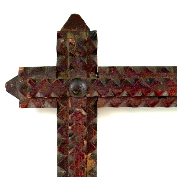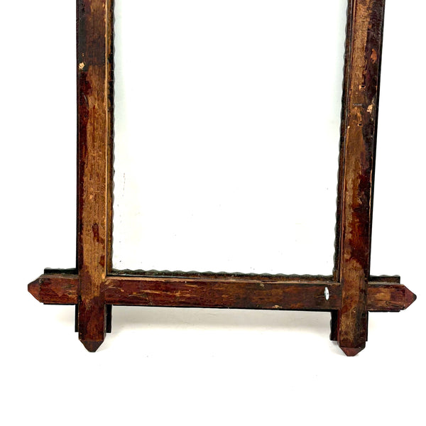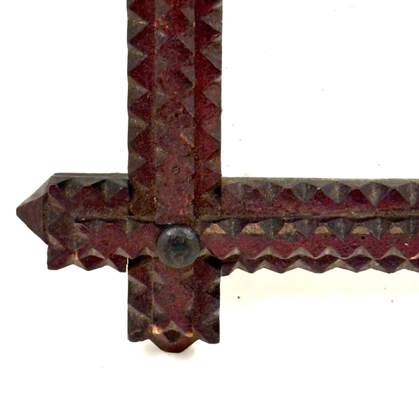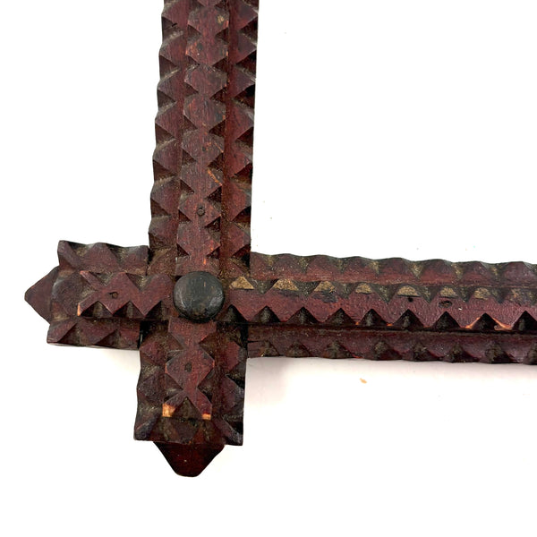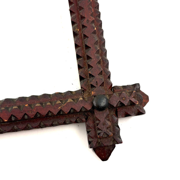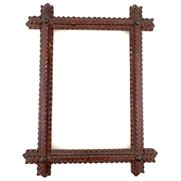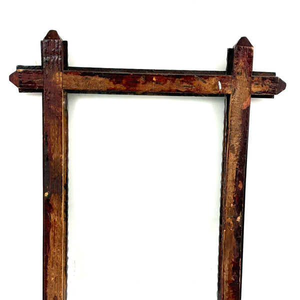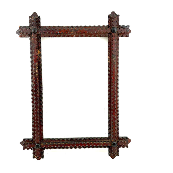 Not a fancy one, but a useful one, and an old one, with original glass, well suited to framing up many a thing. Chip carved details, original dark red paint, with no losses at all that I see, just a little surface wear to the paint as there should.