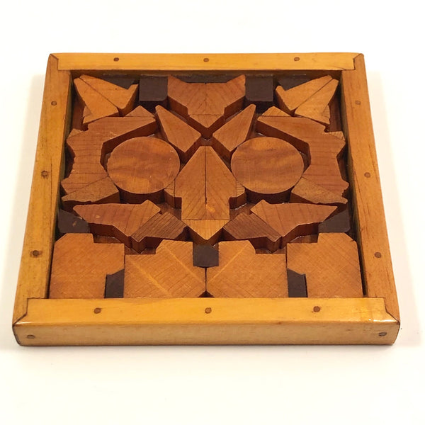 I just love this handmade one-of-a-kind trivet (and I have a second trivet clearly by the same maker, listed separately), which would be equally great placed on the table or hanging on the wall. I imagine it was constructed from bits of scrap wood left over from making other things, and certainly admire the resourcefulness and creativity of its maker in piecing these bits together in such a smart and striking way. There are at least four different colors of stain on the various wooden pieces, and the whole trivet has been varnished giving it a great shine--really a great little piece!