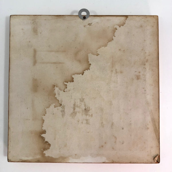 5 1/2" x 5 1/2" x 5/8" thick and in great condition. There is a little metal washer nailed to the back that can swing out, or not, to hang on the wall.