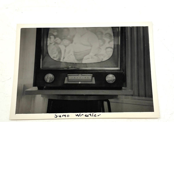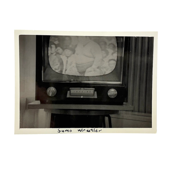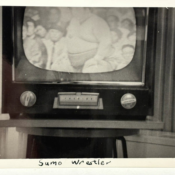 I love a snapshot of a television screen, pointing us to a single second in time, and bringing us straight into the content on what's playing, while also delivering a lot of information in what surrounds it; a TV is nothing if not a frame. And a Sumo wrestler at the center of a mid century American television screen sure feels like an apt portrait of the culture. Perfectly, simply captioned, as if looking toward the future and imagining a time when the ancient Japanese sport of Sumo wrestling, long preceding the founding of America, would be a forgotten form. I think there is so much one could write about this, for me it is another example of a photo that distills a whole world of information, including a whole web of internal and cultural conflicts and contradictions.
