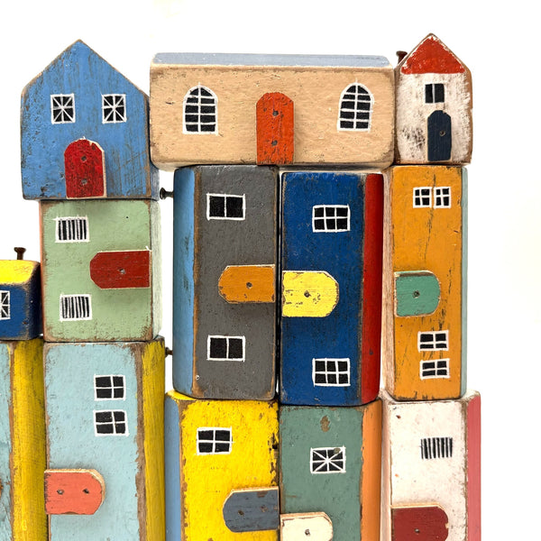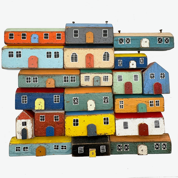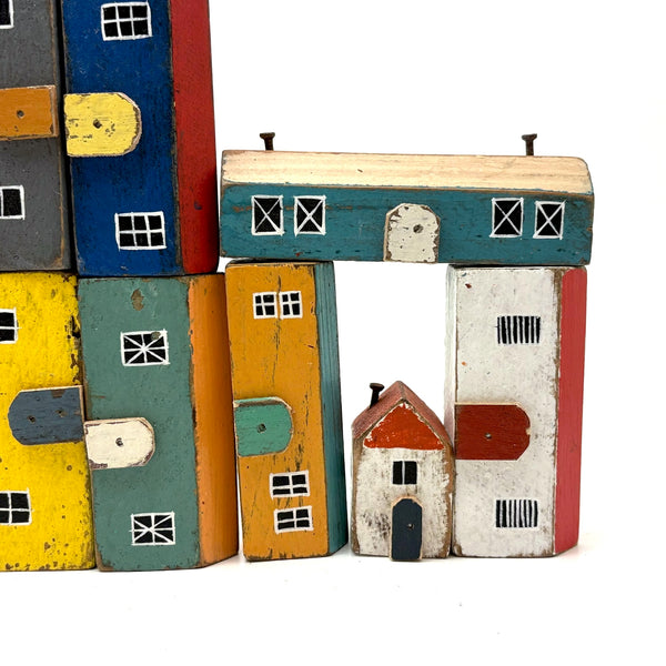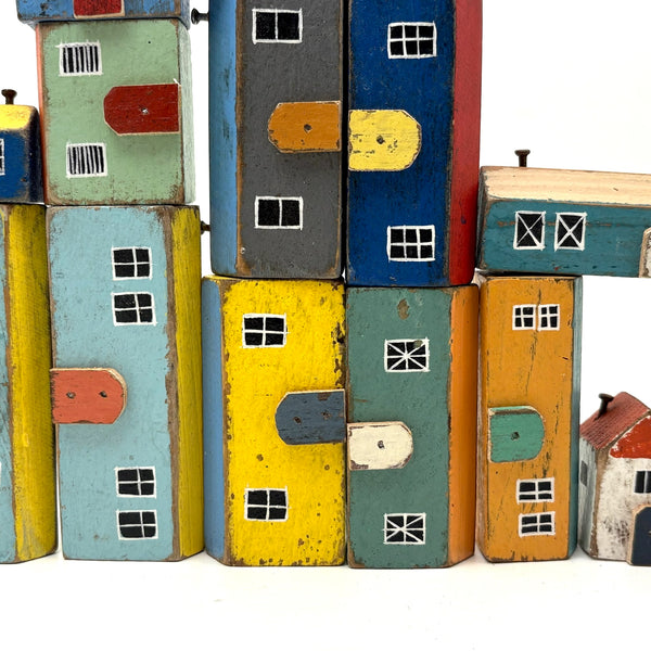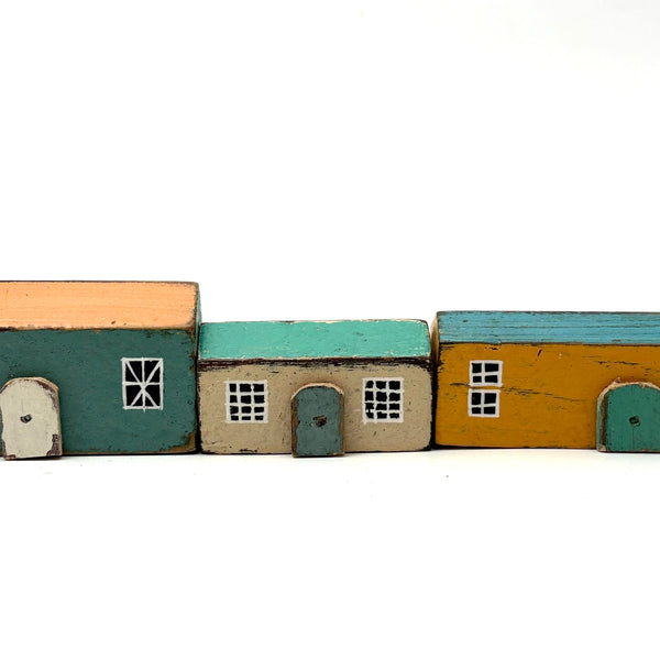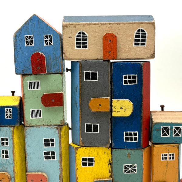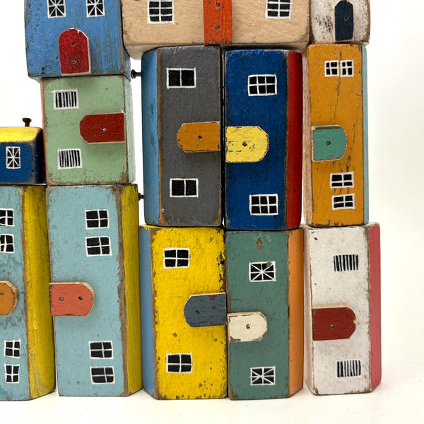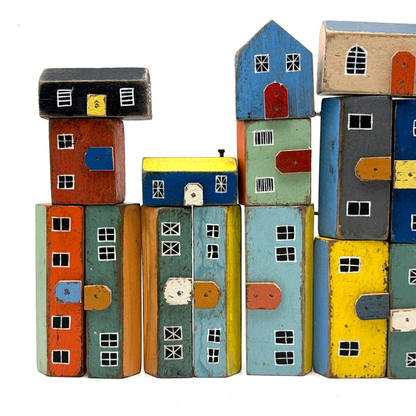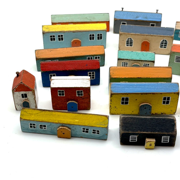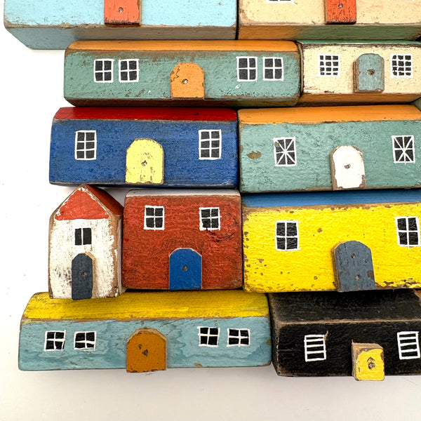 Pure joy. I'm forever looking for little painted wooden houses like these (like next generation American folk art versions of early German Erzgebirge villages) but pretty much never find them, and what could be better than the color combinations here? With carefully cutout wooden doors nailed to their fronts, and hand-painted paned windows on each and every one too. Satisfying like a great set of old homemade painted building blocks, but even better, super.