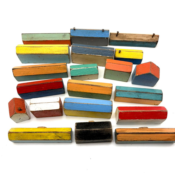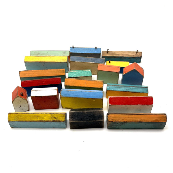 Set of twenty. Longest houses 3 3/4" l, 1 1/8" to 1 1/2" tall. Smallest (little white house with red roof) 1" x 1" . All in great condition, nice general wear, fantastic color. C. 1940s I believe.