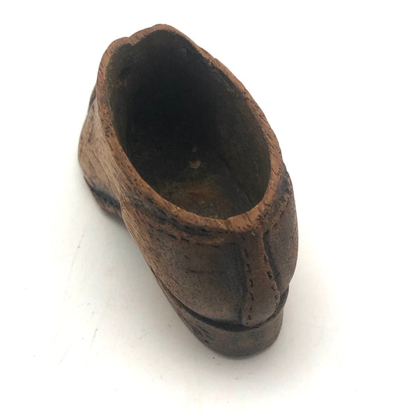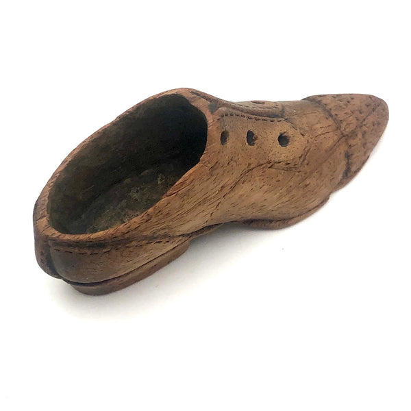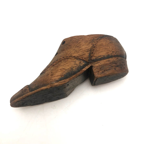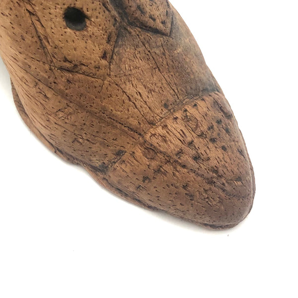 I'll never say no to a folky carved shoe, and really like this little one, sweetly detailed across the toe and along the seams, and deeply carved eye holes. Stitching details around the perimeter of the sole, too, along with a patch of what look perhaps to be some flea bites!