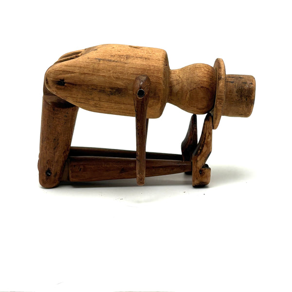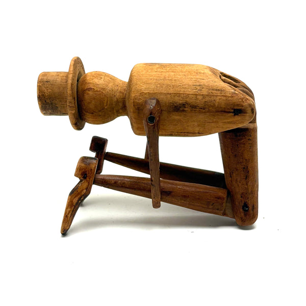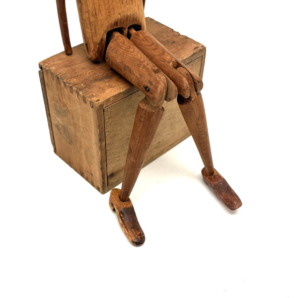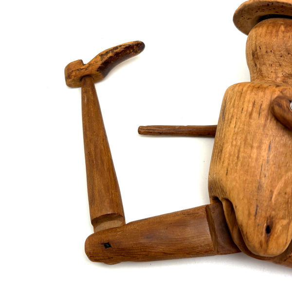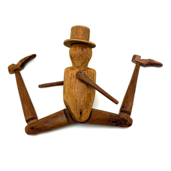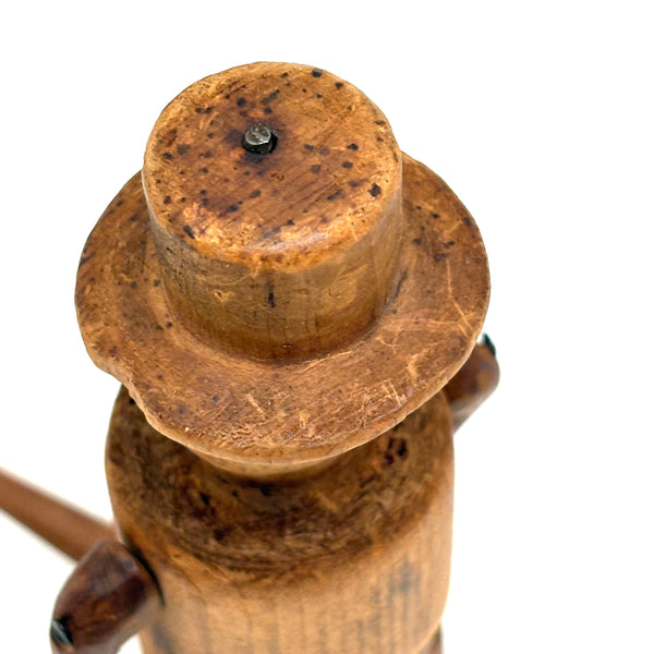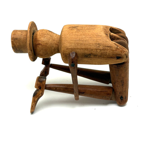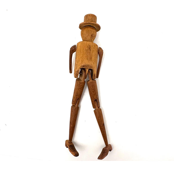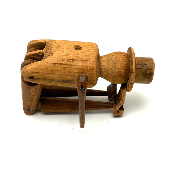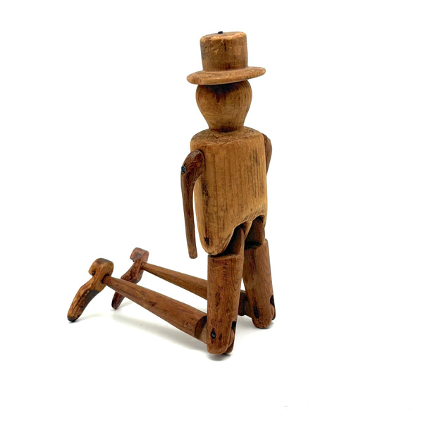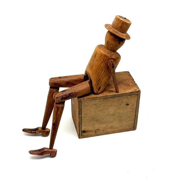 This faceless man in top hat is one of a number of old carved articulated figures listed today, a few of them straight out of an amazing West Coast collection of folk/self-taught/outsider art, and a couple, including this one, found at a show closer to home. When it rains it pours... seems like its been forever since I had a good articulated figure, and now a number of them at once, and I thought a nice thing to list them all at once, as finding the right homes for them is a matchmaking sort of endeavor! For me, carved figures like this are as close to animate beings as handmade things can be, and I love the process of photographing them as a sort of "getting to know you" experience, through which their very individual personalities (and souls, I would say!) reveal themselves, including through discovering how they are able to bend, move, sit, etc. What I especially love about this guy is the combination of his very short (and quite gracefully tapered) arms and his very long legs--making him a very limber limberjack, or dancing doll, or jig figure, whatever you want to call him. Those arms and legs were carved of a different wood than his torso--perhaps he was originally just a carved stump doll of sorts, then transformed into a dancer; I am not completely sure. I like the effect, though, a bit of a Frankenstein, who feels as if he just could not be denied the ability to move!