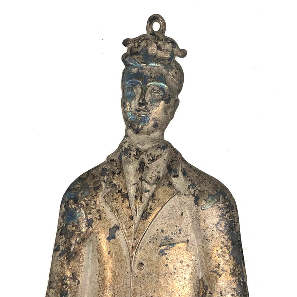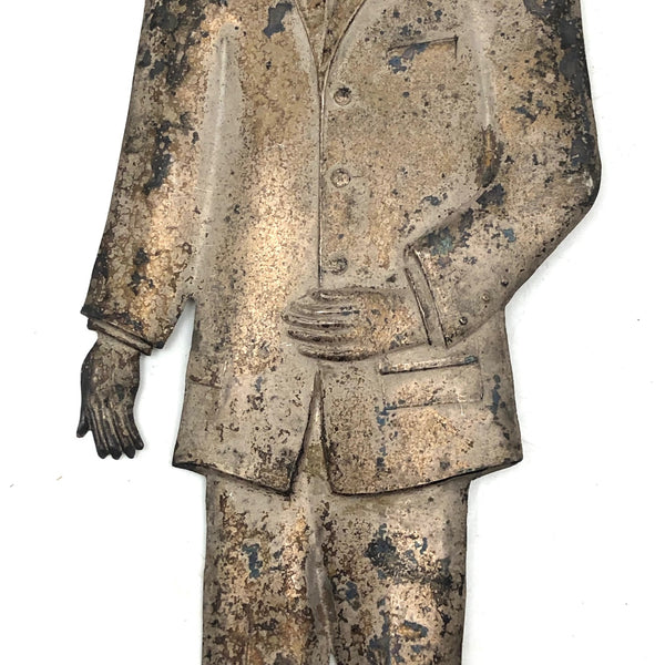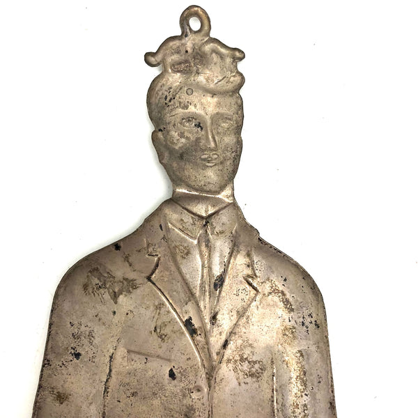 I found a match of this suited man milagro--being sold for much more than I am listing him for--described as an Italian; I don't know otherwise, so will presume that's correct, and believe he dates to the earlyish 20th century. Milagros (also known as an ex-voto or dijes or promesas) are religious folk charms traditionally used as votive offerings for healing purposes--offered to a symbol of a saint as a reminder of a petitioner's particular need (in the form of a leg or heart, say, embodying a wounded body part), or in gratitude for a prayer answered, as well as being carried for good luck. This guy, who I believe had a female counterpart, symbolizing a happy couple) has certainly accrued a patina over the years, seeming quite deserving of a happy homelife now!
