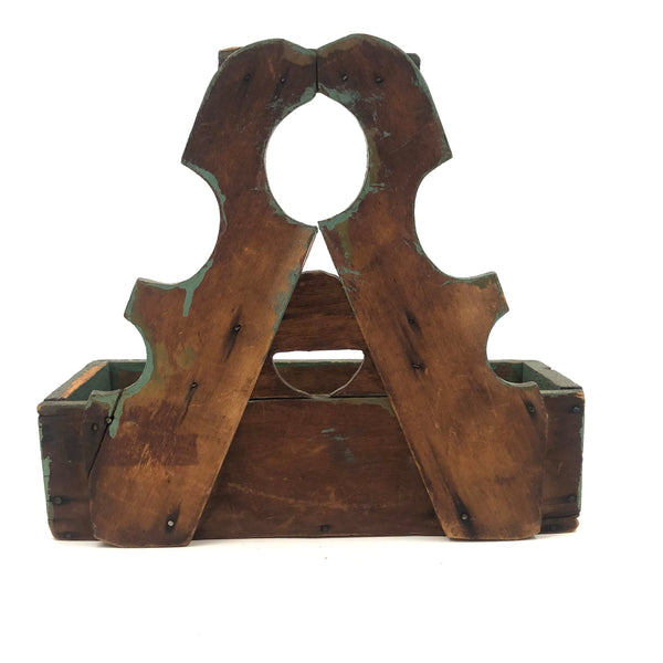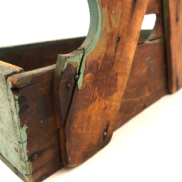 7 7/8" t x 8 3/4" w x 3 1/8" deep. Good antique condition, one nail repaired split visible from the back; I wou;d not put anything heavy in the pocket, but it's s stable and pretty sound.