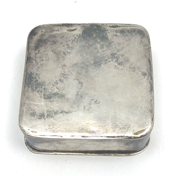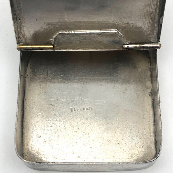 I believe it is silver-plate, as there is brass tone showing through on the face. I have not attempted to polish it though certainly it would polish up some.  It is marked England on the interior. 2 1/16" x 2 1/8" x 11/16". In great structural condition, and the hinge operates super smoothly and lid closes flush.