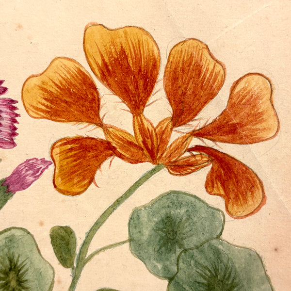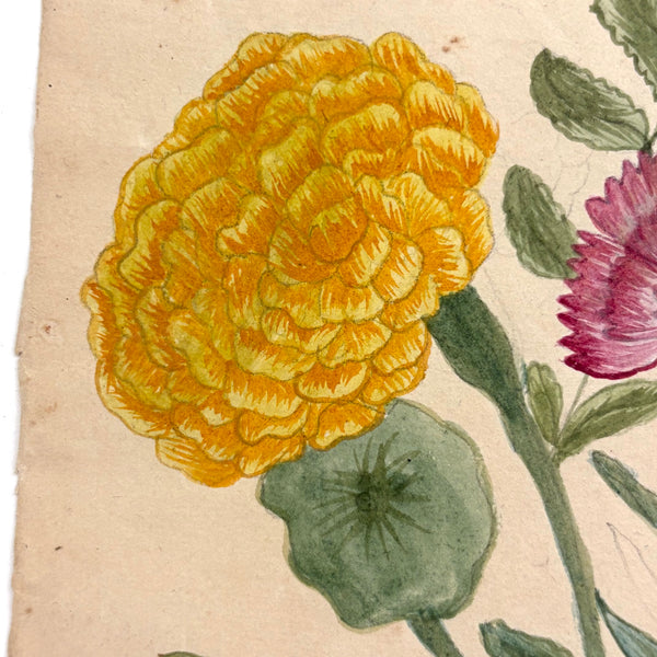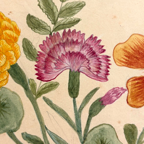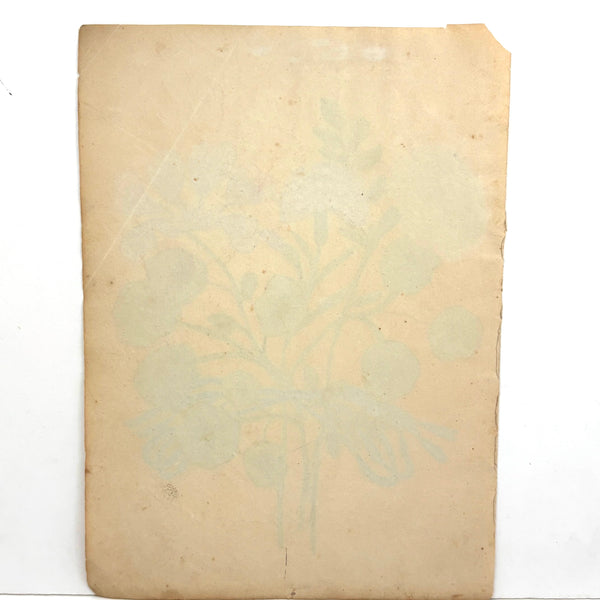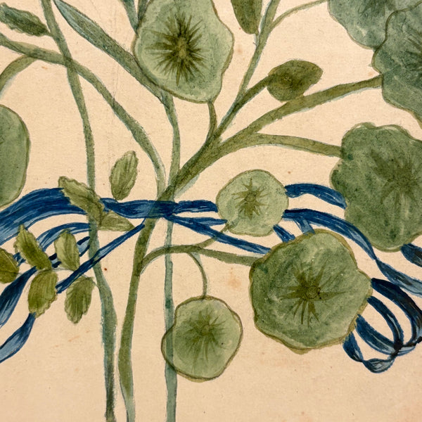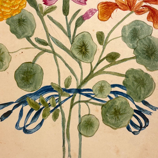 Another lovely naive watercolor found in Pennsylvania, this one purchased from a favorite mostly paper dealer who has been a source of many lovely things. I really love the blue ribbon here, snaking back and forth with no apparent function other than to deliver one more pop of color to complement those blooms. Feels like summer. Late 19th c. I believe.
