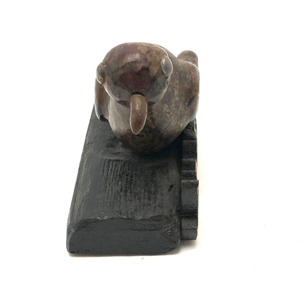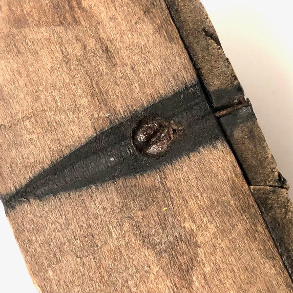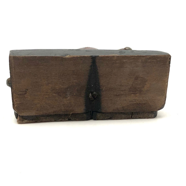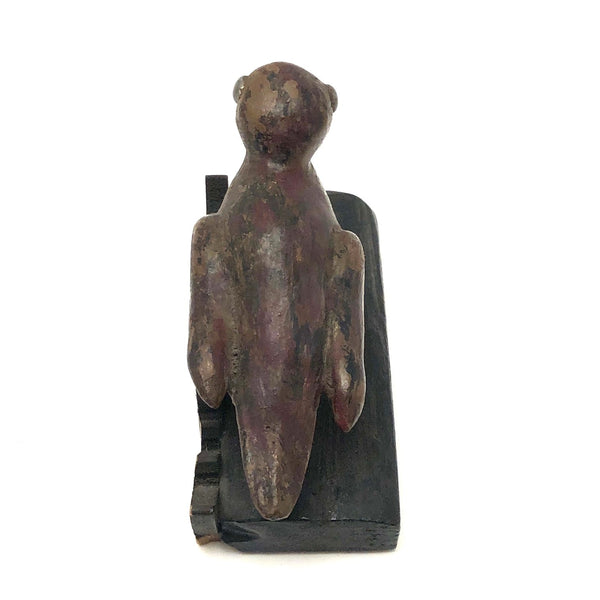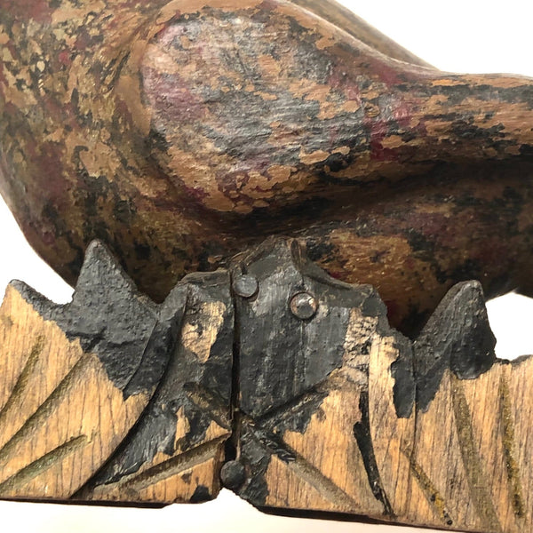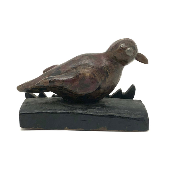 A curious little bird, purchased from a dealer at Brimfield who is a consistently good source of curious carved things--and because I love birds of every ilk. The carved beak on this one looks very ready to do some pecking, and I like its big silver painted eyes, and the folky awkwardness of the whole thing, resting on its bulge of a belly. Painted in a combination of dark red and gold and black that feels a bit reminiscent of grain painting, and with a funny little backdrop of what I presume is meant to be grass, but painted black and if this bird is sitting night watch.
