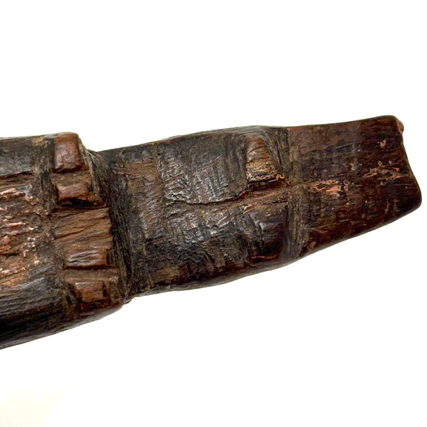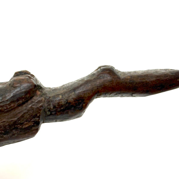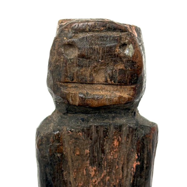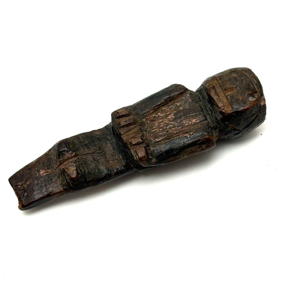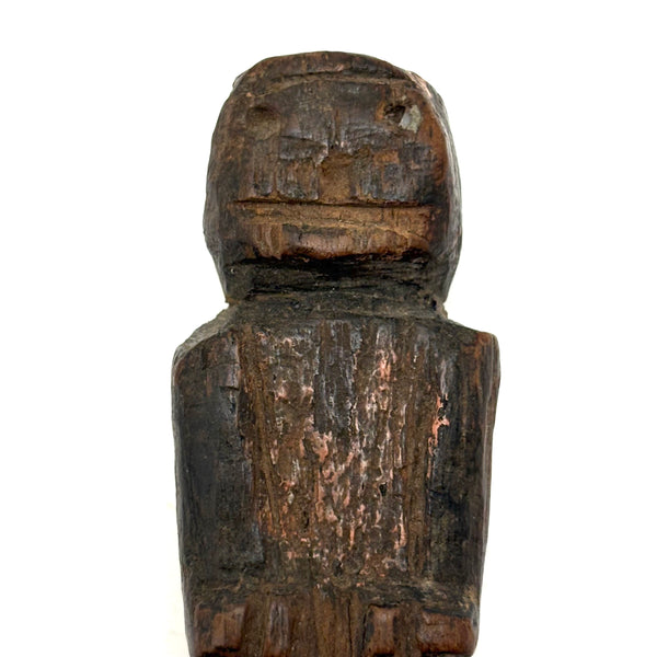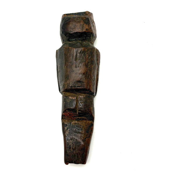 I don't know the origins of this one, but clearly it is quite old, the wood worn very smooth, and with some remnants of a sort of bittersweet paint visible on both the head and the body. The carving of the lower body suggests it might once have slide inside of something else, or perhaps was wrapped in cloth--perhaps a fertility/fetish figure of sorts. Whatever the case, to my eye it doesn't get much better than that very primitively carved face. And he, or perhaps she, is a really nice one to wrap one's fingers around--surely providing protection!