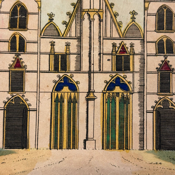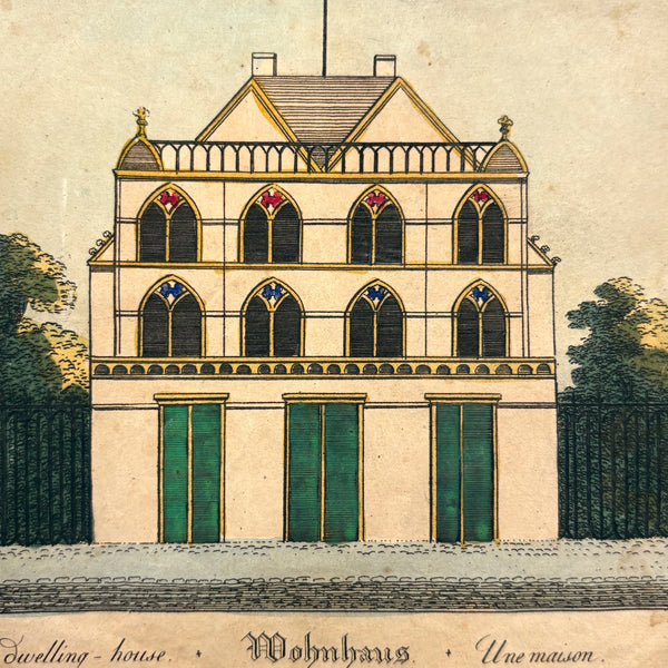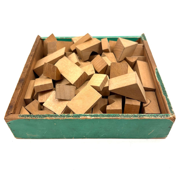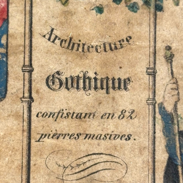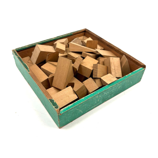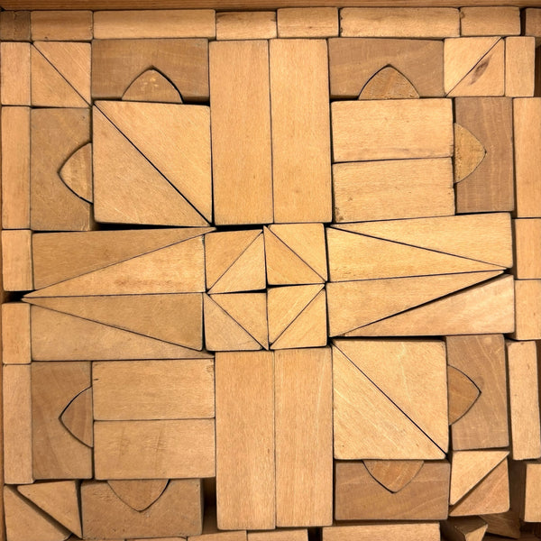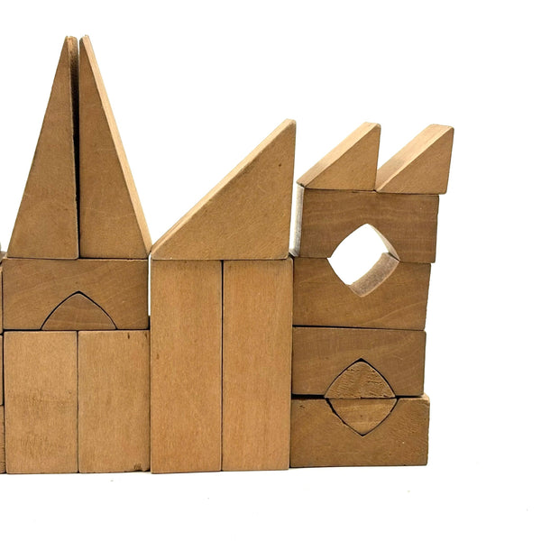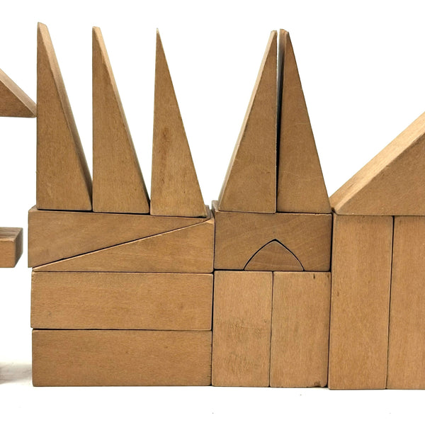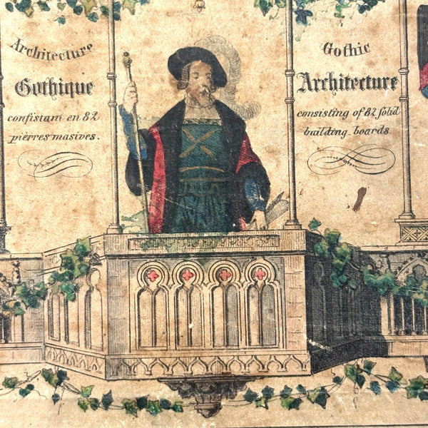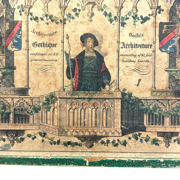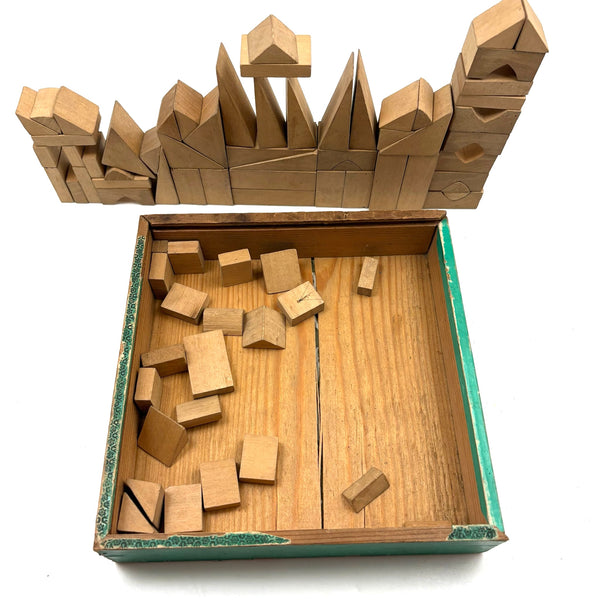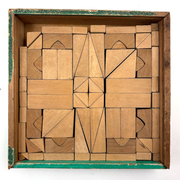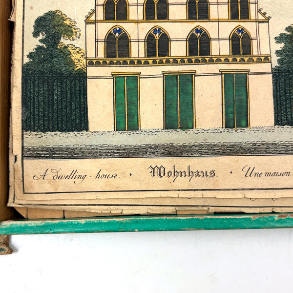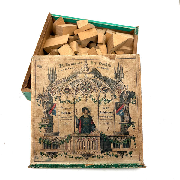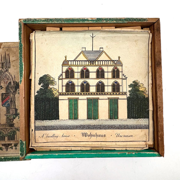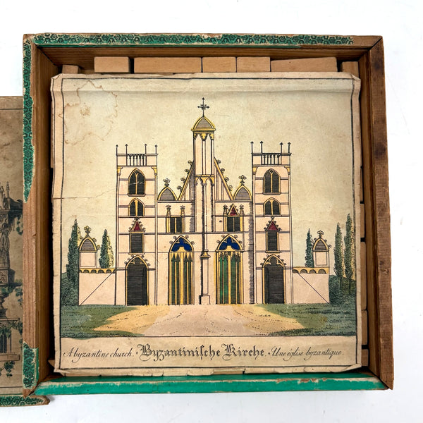 Oh how I love my blocks. And I get especially excited when I find an early and rare boxed set of wooden ones like this, complete with hand-colored lithographs meant to inspire construction.(Probably there were once several more, but two remain, laid flat inside.) This is a German "Gothic Architecture" set, 1850-60, and quite a rare one; I found one closely related set in the archive of a Dutch toy dealer, but not an exact match. On the underside of the slide lid is a printed guide showing how all the blocks are meant to fit together in the box--I found them mixed up but arranged them accordingly, revealing a few blocks missing, but just a couple of perimeter ones. The blocks themselves are very high quality, precisely cut, and a delight to arrange and construct with; I didn't get to spend a lot of time, but they lend themselves to precarious tall towers and satisfying geometric configurations. And just the box itself is terrific, with text in German, French and English on the hand-colored paper label, and pretty green papered sides.