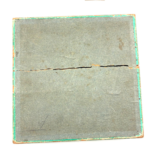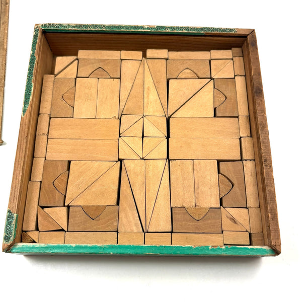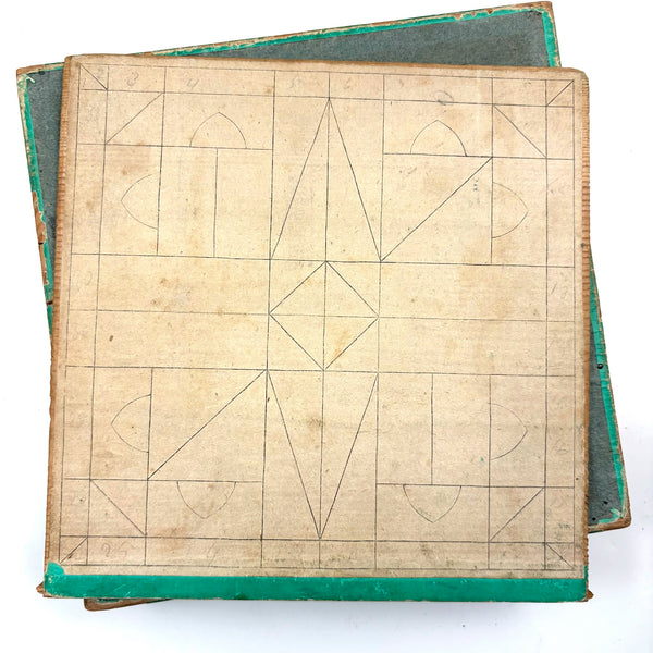 Box 6 7/8" x 6 7/8" x 1 1/2". A few blocks missing as documented, but otherwise very good antique condition, box sturdy and sound, lid closing tight.