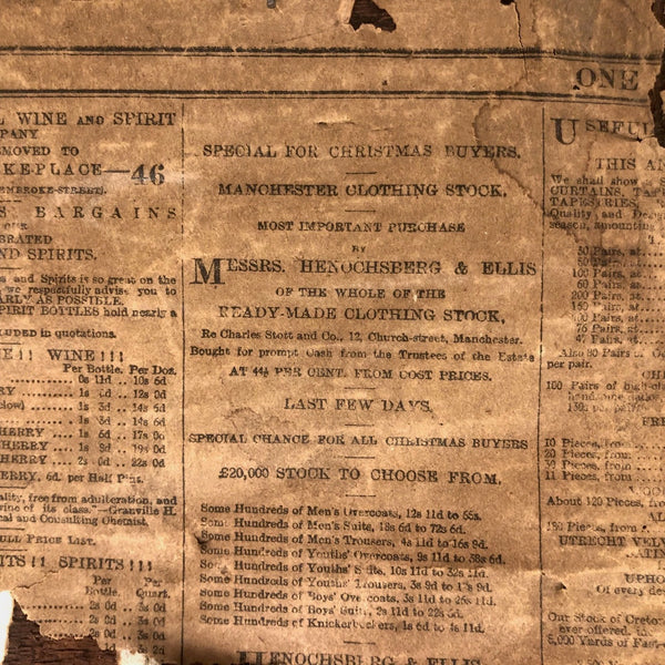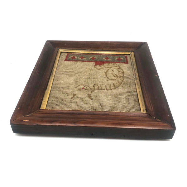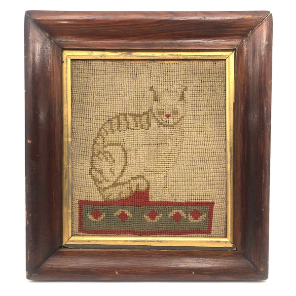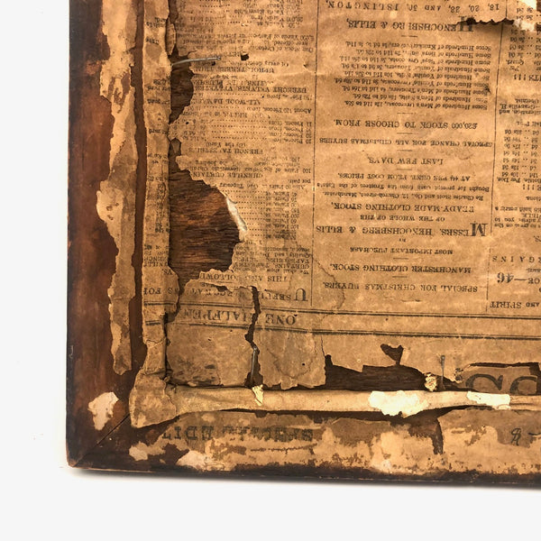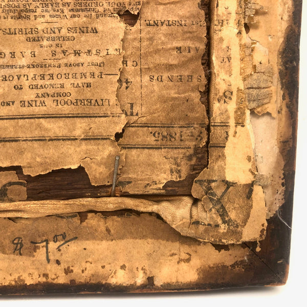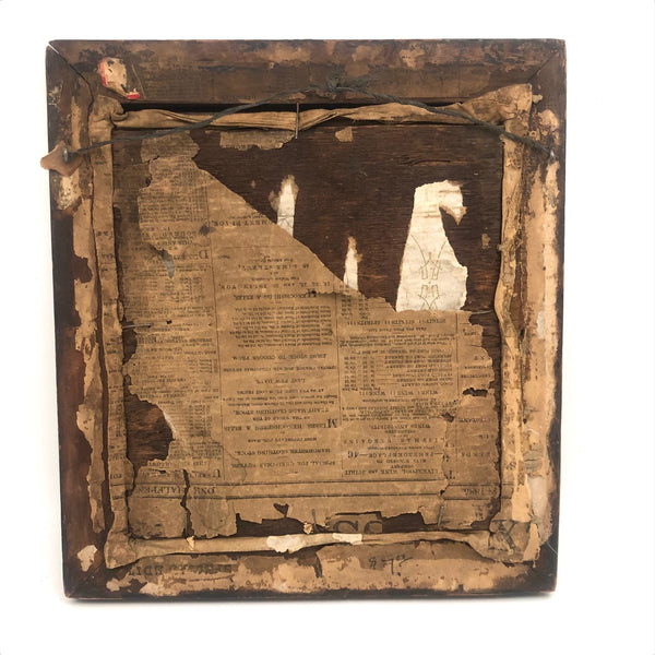 Framed as found, where it appears always to have lived: 11 3/8" x 10 1/4". Sight: 7 3/4" x 6 3/4". No glass, and the frame, is missing a piece along the bottom interior edge. Original wood panel back with newspaper covering dated 1885.