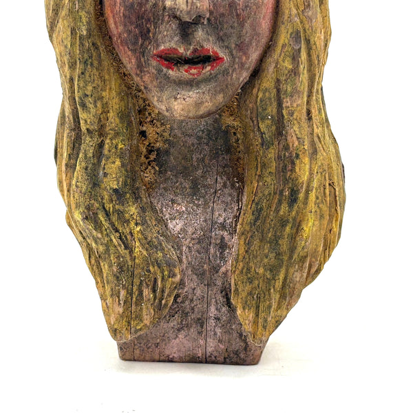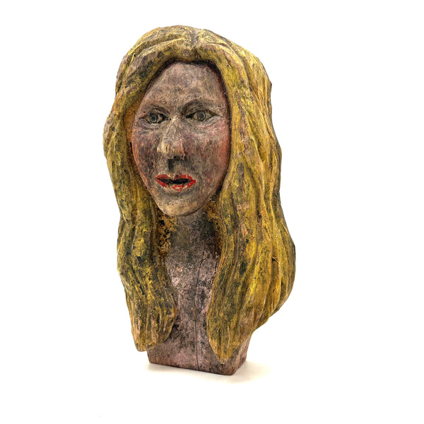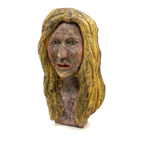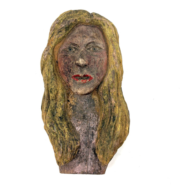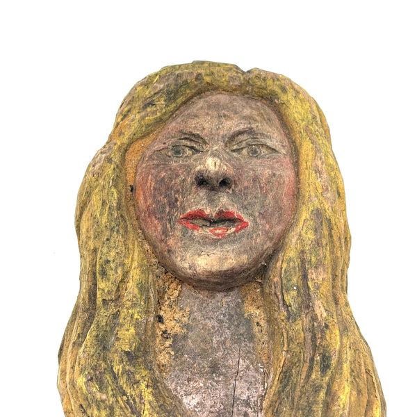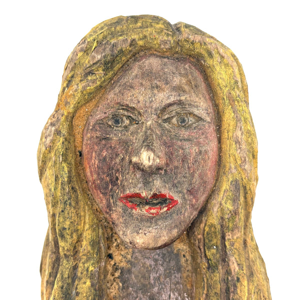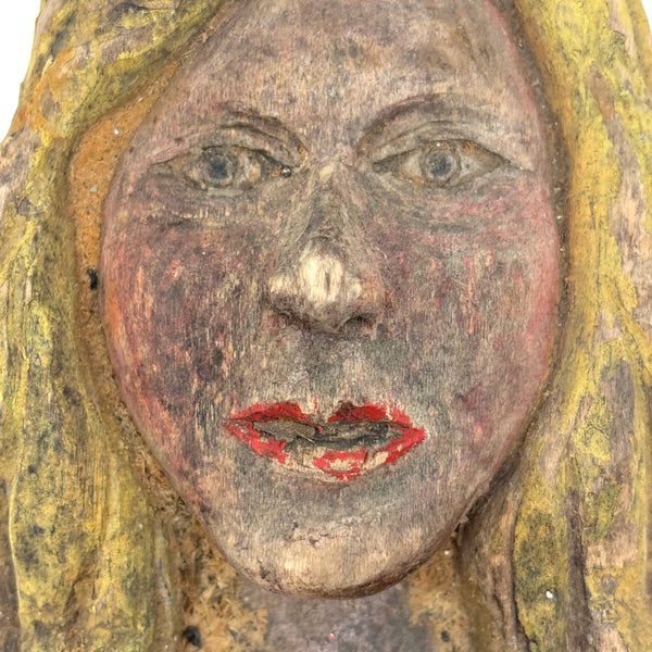 7 5/8" x 4 3/8" x 2 1/8" d. Mid 20th century or so, I believe and found in New England. General wear and age, with some paint loss on her bright red lips. Sound and stable and stands up on her own.