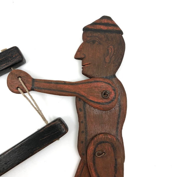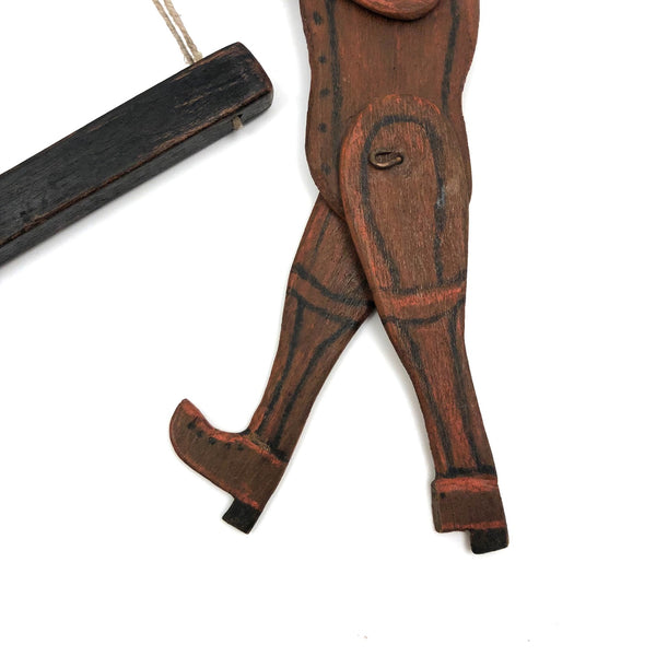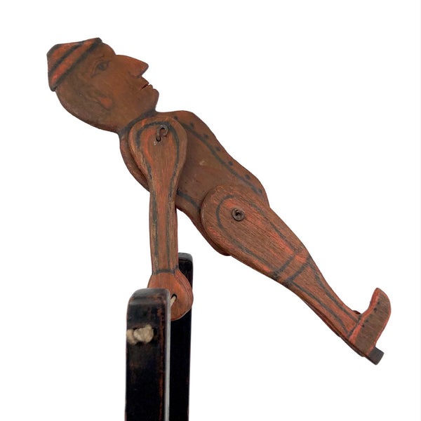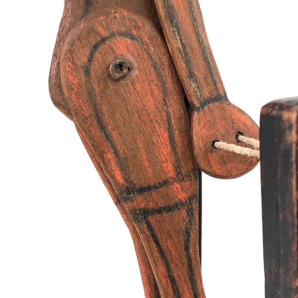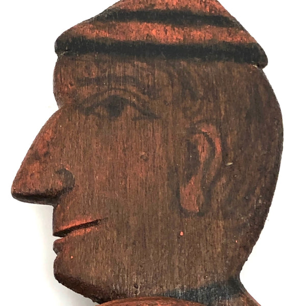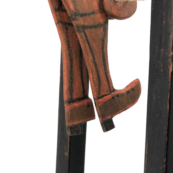 Oh, this face! One of my favorite faces ever, and such a singular one, with huge almond shaped eyes, wispy hair framing giant ears, and hawking nose-- made all the better by the orange and black striped hat resting atop his head, and the carved slit defining his slightly open mouth, making it seem that surely he has something to say! I do believe this is my favorite acrobatic squeeze toy I’ve found (and I've had a bunch), and definitely quite an old one, having lost the toe of one shoe over what I’d think is 125 years at least. Other than that he is in truly excellent shape, flipping around, upside down and into various positions with ease, and with the original wires securing his arms and legs still holding tight. A total charmer.