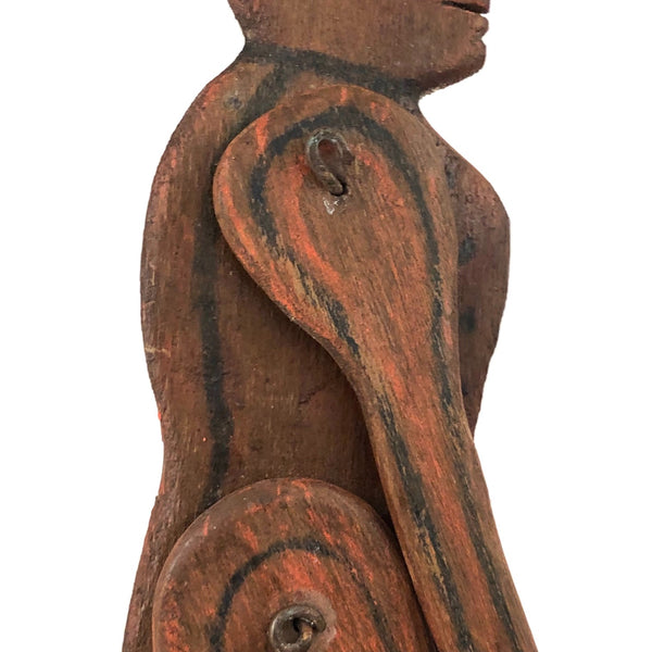 Overall dimensions: 12 3/8" t x 3 3/8" w. Figure measures 7 1/8" tall. The figure is carved of wood with what looks to me like a combination of graphite for the face and either crayon or paint for the orange and black details.