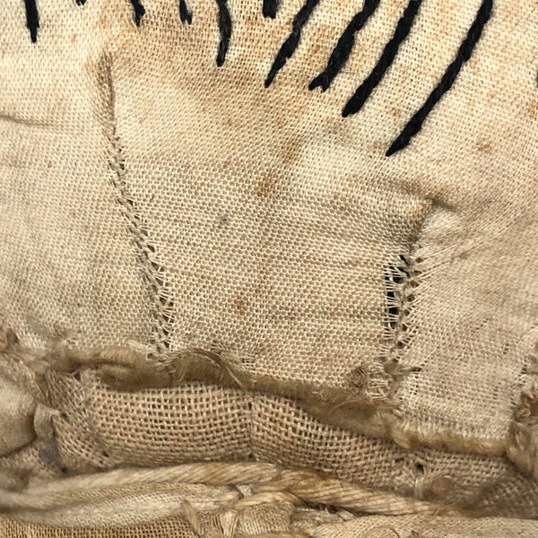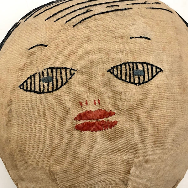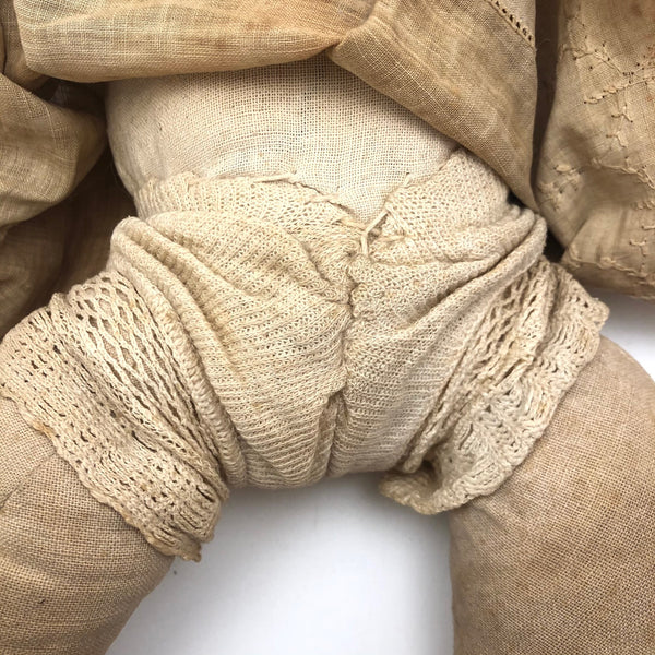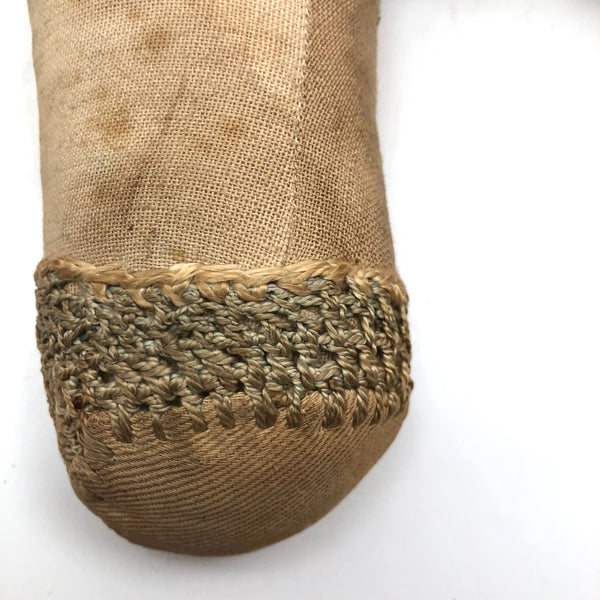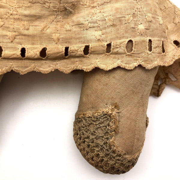 I generally keep an eye out for great old handmade ragdolls, though it is not too often that I find one I both really love and can afford (doll dealers & collectors are a pretty keen bunch!)--but this sweet thing is definitely one, and I think just wonderful. I purchased her from a woman who found her is Perkiomenville, Pennsylvania 50 years ago and has had her in her personal collection since, and I believe the doll is at least twice that in age. The black striped whites of her blue eyes and the marvelous lines of her black hair really get me, all hand-embroidered, and then these great crocheted booties and underwear revealed when one pulls up her linen dress. Densely stuffed with rags, she's very heavy, and any loose seams were lovingly mended long ago--she's super solid and sound.